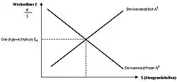 Für die Entstehung eines Gleichgewichtes auf dem Devisenmarkt muss die Bedingung der Zinsparität erfüllt sein. Diese Hypothese besagt, dass die Effektivrendite von in- und ausländischen Kapitalanlagen gleich sein muss. Sie impliziert, dass Zinsunterschiede zwischen in- und ausländischen Kapitalanlagen allein auf erwarteten Wechselkursänderungen beruhen. D. h. beim Gleichgewichtskurs gleichen sich die erwarteten kurzfristigen Renditen an.[3]