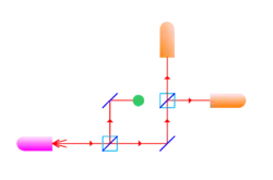 Alternativ kann das Photon auch als Teilchen betrachtet werden. Im ersten Strahlteiler nimmt das Photon dann mit einer Wahrscheinlichkeit von 50 % entweder den unteren Weg oder den oberen Weg. Wenn das Photon den oberen Weg nimmt, trifft es auf das Messobjekt und wird absorbiert. Das Photon erreicht dann keinen der beiden Detektoren. Nimmt das Photon den unteren Weg, kann es wieder auf beide Detektoren treffen, da das Photon ab dem oberen halbdurchlässigen Spiegel beide Wege nehmen kann.