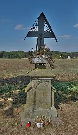 Die Denkmalakte spricht im Übrigen von einem "Wegekreuz, 19. oder 20. Jahrhundert, Sockel Sandstein, neugotische Formen, Kreuz gusseisern, 20. Jahrhundert."