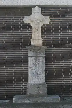 Das etwa 3 m hohe Wegekreuz aus Blaustein steht auf einem neuen Sockel. Im Pfeiler ist eine verwitterte Inschrift mit Chronogramm erkennbar. Das Kreuz hat Eckrundungen und einen flachreliefierten Korpus.
