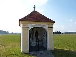 Im 17. oder 18. Jahrhundert wurde die Kapelle als quadratischer Bau errichtet. Die Kapelle trägt ein Zeltdach und ist nach Osten mit einer korbbogigen Öffnung versehen. Rechts und links der Öffnung befinden sich Pilaster. Auf ausgesägten Holztafeln sind ein Kruzifix, sowie Maria und Johannes gemalt. Ursprünglich befand sich in dieser Kapelle die Figur der Schmerzhaften Muttergottes. Diese befindet sich seit 1728/1729 in der Wallfahrtskirche Maria Steinbach. Über der Kapelle erinnert eine Inschrift daran: