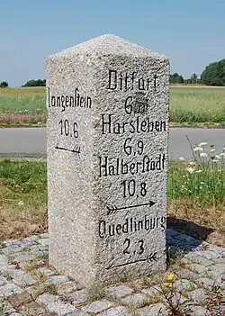 Der aus Granit bestehende kleine Wegweiser wurde in der Zeit um 1900 errichtet. Er gibt in Kilometern die Entfernungen und durch Pfeile die jeweiligen Fahrtrichtungen für mehrere Orte der Umgebung an. Im Einzelnen ist er mit Ditfurt 6,0, Harsleben 6,9, Halberstadt 10,8, Quedlinburg 2,3 und Langenstein 10,3 beschriftet.