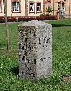 Der kleine Pfeiler besteht aus Granit und wurde vermutlich in der Zeit um 1900 von der Stadt Quedlinburg an einem vorstädtischen Kreuzungspunkt aufgestellt. Er trägt auf zwei Seiten Inschriften, die auf nahe gelegene Orte verweisen. Auf der einen Seite wird angegeben: Wegeleben 10,1 Harsleben 9,5 Halberstadt 13,4. Auf der anderen Seite steht: Ditfurt 5,3. Die Zahlenangaben sind Kilometerangaben. Unter den Inschriften befindet sich jeweils ein Pfeil, der die Richtung angibt.