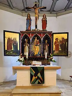 Die Bedeutung der Kirche im Spätmittelalter spiegelt sich auch in den drei erhaltenen mittelalterlichen Flügelaltären wider. Das Retabel auf dem Hauptaltar im Chor ist auf das Jahr 1447 datiert und wurde 1910 und letztmals 1982 restauriert. In der Predella ist ein Relief mit Christus inmitten der zwölf Apostel, der Mittelschrein ist mit farbig gefassten Schnitzfiguren versehen, die Farbfassung erfolgte vermutlich nach Befund im Jahr 1910. In spitzbogigen Öffnungen mit Blendmaßwerk ist eine Strahlenkranzmadonna flankiert von den Kirchenpatronen Nikolaus und Leonhard zu sehen. Die Seitenflügel zeigen in feiner Tafelmalerei auf Goldgrund links Heinrich II. und Kunigunde, rechts Laurentius und Sebaldus. Die Rückseiten der Flügel zeigen links Sigismund von Burgund und Petrus, rechts Andreas und Johannes den Täufer. Im unteren Bereich sind die Stifter dargestellt, links, dem Wappen nach der Patrizier Sigismund I. Fürer von Haimendorf, welcher im Thüringer Wald Erzbergbau und Saigerhüttenbetriebe unterhielt. Rechts ist mit dem Handelszeichen im Wappen sein Faktor dargestellt. Auf Grund der herausragenden Stellung als Kaufmann und Ratsangehöriger in Nürnberg ist anzunehmen, dass der Altar dort, eventuell sogar in einer bedeutenden Werkstatt (möglicherweise vom Meister des Tucheraltars?) gefertigt wurde. Auf dem Schrein ist eine freistehende Kreuzigungsgruppe zu sehen, die Rückseite ist weniger kunstfertig mit der Gregorsmesse gestaltet, darunter das Schweißtuch Christi. Der Seitenaltar an der Chornordwand ist ein Flügelaltar, der 1982 restauriert wurde. Die Predella mit Abendmahlsrelief und seitlichen bemalten Flügeln zeigt links David, rechts Moses. Im Schrein sind Schnitzfiguren zu sehen: Johannes der Täufer, links Jakobus der Ältere und rechts Leonhard; in den Seitenflügeln links Magdalena und Cyriakus, rechts Veit und Margarete. Im geschlossenen Zustand zeigen beide Flügel zusammen den heiligen Georg im Kampf mit dem Drachen. Ein Maßwerkaufsatz ist mit der Schnitzfigur des Erzengels Michael mit der Waage ausgestattet.