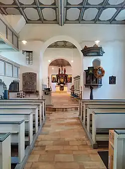 Der Innenraum ist flachgedeckt, im Schiff sind zweigeschossige Emporen eingebaut. Im oberen Bereich der Chornordwand wurden Reste eines Wandmalereizyklus freigelegt (möglicherweise eine Verkündigung), die vermutlich im Zusammenhang mit dem Umbau im 15. Jahrhundert entstanden sind.