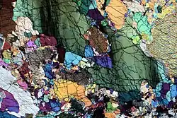 Ein Spezialfall ist die sekundäre Entstehung von Wehrlit aus Dunit (somit die Umkehrung der Dunitisierung), welche durch poikiloblastische Klinopyroxenkristalle, die korrodierte Olivine umschließen, indiziert wird. Die Neukristallisation von Klinopyroxen erfolgte hierbei auf Kosten der aufgezehrten Olivinkristalle des präexistenten Dunits.[16] Für diese Interpretation sprechen ferner reliktische Dunitinseln und -linsen im Wehrlit sowie dessen nahezu fehlende CPO. Der Auslöser dieser Umwandlung dürfte basaltisches Magma gewesen sein, das unter relativ niedrigem Druck den Dunit durchströmte und umkristallisierte – ersichtlich an der interstitiellen Natur der Klinopyroxene, ihrem hohen AlIV/AlVI-Verhältnis und ihrem sehr hohen TiO2-Gehalt.