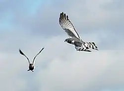 Rechts eine Weißbrauenweihe, helle Farbmorphe und links ein Bronzekiebitz