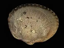 Der Vorderrand fällt steil ab (steiler als der Hinterrand) und ist fast gerade bis schwach konvex gerundet. Der Übergang von vorderen Dorsalrand zum Vorderrand und auch zum Ventralrand sind flach gerundet. Der Übergang vom hinteren Dorsalrand zum Hinterrand ist schwach gerundet. Der Hinterrand selber ist fast gerade oder leicht konvex gewölbt; er fällt flach (flacher als der Vorderrand) zum Ventralrand an. Der Übergang zum Ventralrand ist eng gerundet. Der Ventralrand ist mäßig tief gerundet. Das hintere Gehäusefeld ist durch einen vom Wirbel ausgehenden und zum Übergang Hinterrand/Ventralrand verlaufenden flachen Rücken deutlich abgesetzt. Im Ventralrand ist eine Aussparung für den Byssus vorhanden; auch bei geschlossenem Gehäuse klaffen hier die beiden Klappen. Der innere Gehäuserand ist im Wesentlichen glatt, einige Exemplare zeigen auch schwache Zähnelungen, die mit den radialen Rippen korrelieren.