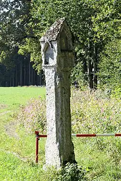 Die Marter ist ein schlanker Pfeiler mit Kreuzrelief und Nischenaufsatz aus Tuffstein und stammt aus dem 16. Jahrhundert.[1]