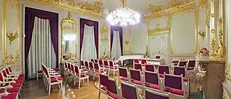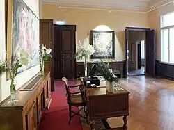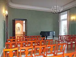 Im ersten Obergeschoss befinden sich die Räume Foyer, Rosenzimmer, Buchenzimmer und Parksalon. In den Ersteren finden regelmäßig mit drei- bis viermaligem Wechsel pro Jahr Kunstausstellungen statt. Der Parksalon dient für wissenschaftliche Vorträge zur Geologie, Erd- und Kulturgeschichte sowie Konzerten mit Swing, Jazz und Blues.[3] Der vergoldete Spiegelsaal im Erdgeschoss ist Konzerten mit klassischer Musik und festlichen Trauungen vorbehalten. Der angrenzende Festsaal kann für private Feiern gemietet werden.