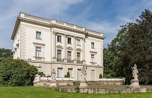 Das Weiße Haus ist ein freistehender, blockartiger, dreigeschossiger Rechteckbau im Neorenaissancestil mit Abmessungen von etwa 20 × 30 Meter. Die in Weiß gehaltene Putzfassade ist im Erdgeschoss und an den Ecken in Rustika gestaltet. Das Haus besitzt auf den Schmalseiten drei Fensterachsen und auf den langen fünf, wobei die mittleren drei davon jeweils in einem risalitartigen Vorbau zusammengefasst sind. Die Vorbauten zeigen in den Obergeschossen je vier korinthische Säulen. Die Fenster des ersten Obergeschosses tragen Bedachungen. Das flache Walmdach wird von einer Balustrade eingefasst, die sich über dem stark auskragenden Hauptgesims erhebt.