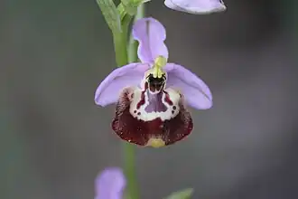 Der Blütenstand umfasst zwei bis sieben Blüten. Die rückwärts gerichtete Kelchblätter erscheinen weißlich bis rosa. Die Kronblätter sind genau wie die braune Lippe rundum behaart. Die Lippe ist schwach gehöckert und weist ein großes aufrechtes Anhängsel auf. Das schildförmige Mal hat einen weißen Rand. Das sehr kleine Basalfeld ist umgreifend, diese braunviolette Fläche erscheint oft hell marmoriert. Nur selten sind klare Linien zu erkennen.