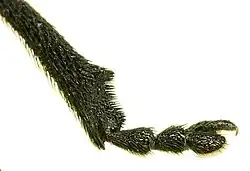Die wegen der fehlenden Oberlippe frei liegenden Oberkiefer enden in zwei großen Zähnen, auf der Innenseite befindet sich basal ein weiterer Zahn. Die Unterkiefer bilden eine große behaarte Lade. Die Kiefertaster entspringen nahe dem Ende der Unterkiefer und sind viergliedrig, das letzte Glied ist winzig. Die Lippentaster sind kurz und dreigliedrig. Das Basalglied ist rechteckig kürzer als breit und mit zwei Borsten versetzt. Das mittlere Glied ist becherförmig, das Endglied winzig. Das Schildchen ist dreieckig zugespitzt.