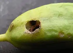 Nach der Paarung beginnt die Eiablage, die sich von Juli an über einen längeren Zeitraum erstreckt. Zur Eiablage wird die dicke fleischige Fruchtwand mit dem Rüssel ganz durchbohrt und die darunter wie in Geldrollen angeordneten flachen Samen angenagt. Die Eier werden anschließend mit der ausstülpbaren Legeröhre in die Samen abgelegt. Das Loch für die Eiablage verschließt sich schnell, sodass die Eier sich gut geschützt entwickeln können. In eine Frucht können mehrere Eier abgelegt werden. Die Gesamtzahl der abgelegten Eier ist vergleichsweise gering. Das Loch für die Eiablage ist äußerlich nicht von einem Fraßloch unterscheidbar.