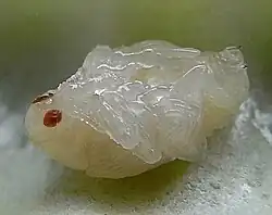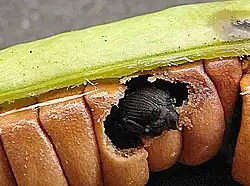 Die beinlosen weißen Larven entwickeln sich rasch. Noch vor der Reifung der Samen kann man befallene Samen an deren vorzeitigen Bräunung erkennen. Gegen Ende ihrer Entwicklung hat die Larve auch die benachbarten Samen angefressen. Häufig werden die Samen bis auf einen Ring ausgefressen. Die Puppenwiege erstreckt sich über gewöhnlich drei benachbarte Samen. Der mittlere ist ringförmig, die beiden angrenzenden napfförmig ausgefressen. Bald finden sich von früh gelegten Eiern bereits geschlüpfte Käfer sowie von später abgelegten Eiern Puppen (Abb. 11) und auch noch Larven gleichzeitig in den Früchten.