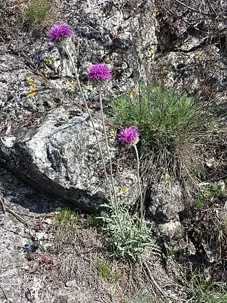 Die Blütezeit liegt meist im Mai, seltener auch im April und Juni.[3] Der Blütenkorb hat einen Durchmesser von 30 bis 45 Millimetern. Die Korbhülle ist fast kugelig und spinnwebig, die Hüllblätter sind besonders an ihrer Basis dicht wollig behaart, lineal-lanzettlich, etwa 1 Millimeter breit mit feiner, dorniger, zurückgebogener Spitze.[2] Die duftenden Blüten sind purpurfarben. Die Staubbeutel haben lanzettliche Schwänzchen.[2]