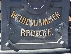 In der Zeit von etwa 1932 bis 1959 trug die Brücke in amtlichen Kartenwerken die (eigentlich korrekte) Bezeichnung Weidendammbrücke,[11] da sie nach dem Weidendamm und nicht nach einer Stadt namens Weidendamm benannt worden war.