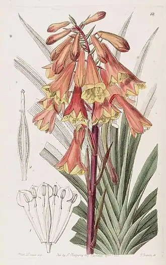 In einem lockeren traubigen Blütenstand sind bis zu 20, jeweils an einem kurzen Blütenstiel hängenden Einzelblüten angeordnet. Die leuchtend roten (lat. puniceus „granatapfelfarben“), am Ende gelb gesäumten, hängenden, glockenförmigen Blüten sind etwa 3 cm lang. Die sechs stark röhrenförmig verwachsenen, gleichgestaltigen Blütenhüllblätter (Tepalen) laufen am Ende in kurze Kronzipfel aus.