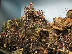 Als Begründer der sinnfälligen Darstellung des Weihnachtsgeschehens galt früher Franz von Assisi, der 1223 in Greccio anstelle einer Predigt das Weihnachtsgeschehen mit Menschen und lebenden Tieren nachstellte. Diese These ist mittlerweile überholt; schließlich stellten die Geschehnisse in Greccio auch eher ein Krippenspiel denn eine figürliche Krippendarstellung dar. Mit der Krippenfeier von Greccio steht möglicherweise das in Frauenklöstern des 13. und 14. Jahrhunderts verbreitete Christkindlwiegen in Verbindung. Im 14. und 15. Jahrhundert entwickeln sich erste statische Krippendarstellungen, vor allem in Italien.[38] Aus dem Jahr 1478 ist eine Liste von Krippenfiguren erhalten, die für die Kirche San Giovanni a Carbonara in Neapel geschnitzt werden sollten: die Heilige Familie, Ochs und Esel, drei Hirten, zwölf Schafe, zwei Hunde, vier Bäume, elf Engel und je zwei Propheten und Sibyllen. Einige dieser Figuren sind erhalten.[39]