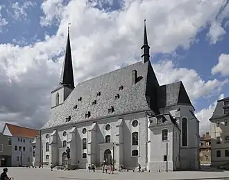 Im Jahr 1250 ist dann auch erstmals die Rede von einer Siedlung, die sich aber schon früher im Schutze der Burg gebildet haben musste. Zwischen 1245 und 1249 wurde die spätere Stadtkirche erbaut und spätestens 1254 dem Apostel Peter und bis 1433 beiden Aposteln Peter und Paul geweiht. Das Patronat der Stadtkirche wurde am 16. September 1284 dem Deutschritterorden übergeben, der die Geistlichen bis zur Reformation stellte. Der Orden, der der Diözese Mainz unterstellt war, verfügte über einen ausgedehnten Grundbesitz um die Stadtkirche herum und in der Rittergasse, der 1525 der Stadt zufiel. Spätestens seit 1307 war der Ritterorden mit dem Schulwesen betraut,[7] mit der Krankenpflege ab 1383 in einem Spital an der Stelle des heutigen Marstalls.[8]