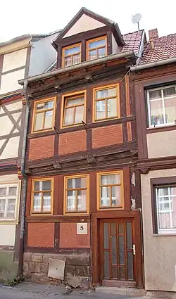 Das zweigeschossige, barocke Fachwerkhaus entstand nach einer an der Stockschwelle befindlichen Datierung im Jahr 1701. Der nur vier Gebinde breite Bau weist an seinem Fachwerk ein profiliertes Brüstungsholz auf. Die Gefache sind mit Ziegelsteinen ausgemauert.