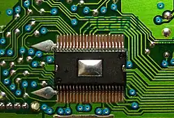 Von Bedeutung ist das Wellenlöten auch bei der Montage von SMD-Bauteilen auf der Platinenunterseite. Dabei müssen die einzelnen Bauelemente auf die Leiterplatte geklebt werden. Bei Bauelementen mit engem Pinabstand, wie integrierten Schaltungen, sind dabei neben einer bestimmten Orientierung in Bezug zu der Richtung der Lötwelle auch spezielle Kupferflächen (Pads) auf der Leitbahn nötig, um Kurzschlüsse durch den Wellenlötprozess zu vermeiden. Dazu dienen z. B. die in nebenstehender Abbildung dargestellten zwei pik-förmigen Lötflächen auf der linken Seite des ICs, welche das Lötzinn der Welle abstreifen. Die Richtung der Lötwelle kommt dabei vom rechten Bildrand.