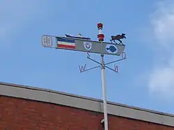 Die Wetterfahne auf dem Gebäude 1 (der Markthalle) ist ein Wahrzeichen des Seefischmarktes. Der Elch symbolisiert die Eingliederung der vielen Fischer aus den verlorenen Ostgebieten des Deutschen Reiches. Der Fischdampfer steht für die moderne Hochseefischerei, die für einen Seefischmarkt lebenswichtig ist. Der Leuchtturm in der Mitte soll Kiel als Ansteuerungspunkt zeigen (Der Leuchtturm Kiel wurde von der Fa. Ambau auf dem Seefischmarkt gebaut). Der Butt darunter steht für die schleswig-holsteinische Kutterfischerei. Das Kieler Wappen und die Landesfarben deuten auf die Gesellschafter der Kieler Seefischmarkt GmbH. Das abschließende Firmenlogo besteht seit Anfang der 1950er Jahre.[8]