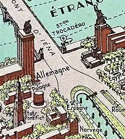 Trocadéro mit deutschem Pavillon (links), belgischem Pavillon (rot) und Eiffelturm -