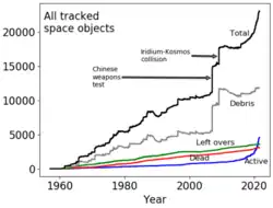 Wie auch bei wirtschaftlicher Tätigkeit auf der Erde durch z. B. Umweltverschmutzung können durch die mit der Weltraumwirtschaft verbundenen Aktivitäten negative Externalitäten entstehen. So kommt es z. B. durch Weltraumschrott zu einer regelrechten Vermüllung des Weltraums, ein Problem, welches durch die steigende Anzahl der Objekte in der Erdatmosphäre verschärft wird. Millionen kleiner Fragmente und Trümmerteile von Satelliten und Raketen umkreisen die Erde und erhöhen die Kollisionsgefahr. Ein weiteres Problem ist die durch die steigende Zahl an Satelliten ausgelöste Veränderung des Nachthimmels, welche die astronomische Beobachtung auf der Erde erschweren könnten.[28][9] Allein zwischen 2012 und 2022 stieg die Anzahl der aktiven Satelliten um das Siebenfache.[29]