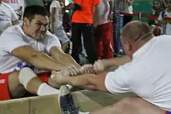 Mas-Wrestling, ein von sibirischen Völkern stammender Sport. Auf Anweisung des Kampfrichters greifen die Wettkämpfer mit ihren Handflächen einen 50 Zentimeter langen Stock und ziehen beide daran. Quetschen oder Stoßen sind während des Wettkampfs nicht zulässig, das Berühren der Hand des Gegners ist ebenfalls verboten. Der Athlet, der den Stock zu seiner Seite zieht, setzt den Kampf fort, bis sein Gegner den Stock loslässt. Gewinner ist auch, wer den Körper seines Gegners auf seine Seite zieht. Darüber hinaus gilt das Spiel als gewonnen, wenn die Füße des Gegners das Stützbrett verlassen, das zwischen beiden am Boden ist. Es gibt Gewichtsklassen. Um zu siegen, muss ein Wettbewerber zwei Runden gewinnen.[11]- Ssireum (씨름) koreanisches Ringen auf Sand. Die Kämpfer sind barfuß.