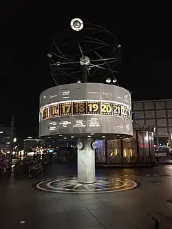 Die Weltzeituhr auf dem Alexanderplatz im Berliner Ortsteil Mitte (auch: Urania-Weltzeituhr) ist eine Uhrenanlage in Baueinheit mit einer symbolischen Weltdarstellung. Sie enthält auf ihrer metallenen Rotunde die Namen von 146 Orten sowie einen zusätzlichen Eintrag zur Datumsgrenze.[1] Seit ihrer Aufstellung 1969 ist die zehn Meter hohe Weltzeituhr ein beliebter Treffpunkt für Berliner und Touristen in der deutschen Hauptstadt. Seit Juli 2015 steht die Weltzeituhr unter Denkmalschutz.[2]
