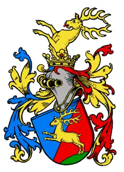 Das Wappen (1699) zeigt im von Blau und Rot schräglinks geteiltem Schild auf grünem Hügel einen goldenen springenden Hirsch. Auf dem Helm mit rechts blau-goldenen und links rot-goldenen Decken der Hirsch wachsend.[3]