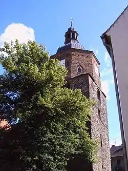 Der Kirchturm war zunächst nur als Ruine bestehen geblieben. 1704 begann der Wiederaufbau, der 1709 abgeschlossen wurde. In diesem Jahr wurde auf den erhalten gebliebenen quadratischen Turmstumpf ein achteckiger, mit Backsteinen verblendeter Aufbau in Fachwerkbauweise errichtet. Den Turmabschluss bildet eine Welsche Haube mit Laterne und Spitze. Bis zur Fertigstellung des Turms war ein hölzerner Glockenstuhl in Gebrauch. Im Jahr 1715 waren dann auch wieder alle Glocken repariert oder umgegossen. Ein aufgerichteter Stern von Betlehem über einem niederliegenden Halbmond bekrönte den Turm, mit dem die Erbauer ihre Freude über den abgewendeten Vormarsch der Türken ausdrückten.