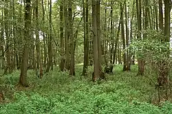 Au- und Bruchwälder werden von Schwarzerle, Gewöhnlicher Esche, Moorbirke, Gewöhnlicher Traubenkirsche, Gemeiner Hasel, Stieleiche, Flatterulme, Feldulme und Blutrotem Hartriegel gebildet. Dazu gesellt sich Echter Hopfen. In der Krautschicht siedeln beispielsweise Sumpfsegge, Waldengelwurz, Sumpfschwertlilie, Großes Hexenkraut, Gewöhnliches Hexenkraut und Rasen-Schmiele. Die Wälder verfügen über einen hohen Alt- und Totholzanteil.