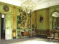 Das französische Gesetz der Symmetrie bestimmt ebenfalls die Anordnung der Innenräume. Das ursprüngliche Vestibül in der Mitte beim Eingang, wird auf beiden Seiten von je zwei kleinen getrennten Zimmern flankiert. Die schmale Halle am Eingang war damals noch ohne Treppe, weil zur Zeit Zaeslins ja kein Obergeschoss vorhanden war. Auf der Stadtseite ist das äusserste Zimmer als intimes Boudoir gestaltet. Eine besonders schmucke, mit Gold verzierte Stuckdecke überzieht die ganze Fläche des Plafonds; die Ornamentik steht dem Régencestil näher als dem Barock. Auf der Gartenseite liegen die drei grossen Festsäle, in der Mitte mit drei Fenstertüren, seitlich mit je zwei Fenstern. Diese Säle sind jeweils durch Türen, die an einer Fluchtlinie liegen, miteinander verbunden. Grazile Stuckdekorationen zieren die Plafonds der Säle. Eine Küche und Schlafstuben fehlten in diesem Haus. Die Speisen wurden über den Vorhof zugetragen, zum Wohnen und Schlafen hatten sich Generationen von Bewohnern in dem Altbau nach ihrem Geschmack eingerichtet.