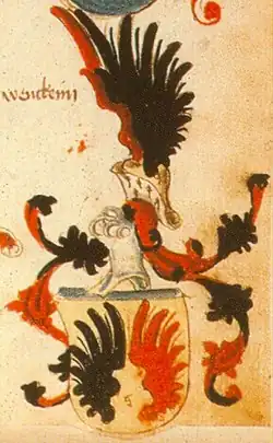 Der Wappenschild zeigt einen offenen Flug in Rot und Schwarz auf goldenem Grund. Die Helmdecken sind gold, rot und schwarz. Die Helmzier ist wieder der offene Flug in Rot und Schwarz.