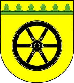 Blasonierung: „In Gold ein sechsspeichiges schwarzes Wagenrad unter einem grünen Rautenkranz im Schildhaupt.“[7]