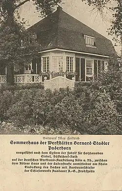 Auf der Ersten Deutschen Werkbundausstellung 1914 in Köln stellte man dann das Leistungs- und Einrichtungsprogramm des Unternehmens mit dem Sommerhaus der Werkstätten Bernard Stadler Paderborn[113][114][115][116] vor (ausgeführt nach dem System der Fabrik für Holzhausbau Siebel in Düsseldorf-Rath, die auch auf der Weltausstellung in Brüssel 1910 ausstellte und dort mit einem Großen Preis sowie einer Silbernen Medaille ausgezeichnet wurde)[117] mit elf Zimmern, zu deren Einrichtung und Ausstattung der „Kölner Anzeiger“ bemerkte: „… man hinübergeht zu dem unter hohen Pappeln versteckten Sommerhaus, das die Werkstätten von Bernard Stadler (Paderborn), nach dem Entwurfe von Max Heidrich, neben dem Kölner Hause errichteten. Mit den guten Ecklösungen, der schlichten, wirkungsvollen Gliederung, den kleinen Terrassen und der wohlabgestimmten Dachlösung ist das ganze ebenso einheitlich wie mannigfaltig und freundlich einladend und hat den Ruf der Werkstätten wieder vollauf bewährt. […] Was das Aeußere verspricht, findet man dann im Innern bestätigt.“[118] Zudem lieferten die Werkstätten Bernard Stadler sämtliche Möbel und Vertäfelungen für das „Gelbe Haus“ von Bruno Paul, das wie folgt kommentiert wurde: „Das Haus ist mit das Schönste, was die Ausstellung zu bieten hat.“ Die Werkbundausstellung wurde vorzeitig im August 1914 wegen Beginns des Ersten Weltkriegs beendet. Otto Stadler diente während des Krieges als Offizier in einer Fußartillerie-Batterie.