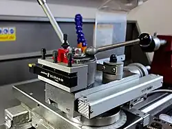 Bei der Bearbeitung von Werkstücken durch Werkzeugmaschinen sind für verschiedene Arbeitsschritte unterschiedliche Werkzeuge erforderlich. Damit der Fertigungsvorgang nicht nach jedem Schritt unterbrochen werden muss, damit das Werkzeug gewechselt werden kann, werden mehrere Werkzeuge in einen drehbaren Werkzeughalter eingespannt. Nach jedem Schritt wird der Werkzeugrevolver so in die Arbeitsebene gedreht, dass das zum nächsten Schritt passende Werkzeug zum Einsatz kommen kann. Die Werkzeuge werden dazu im Werkzeugkopf so eingemessen und eingespannt, dass sie in der Serienfertigung für die jeweiligen Schritte bereits richtig zum Werkstück positioniert sind.