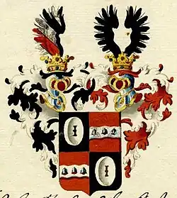 - Blasonierung des Wappens von 1787: Von Schwarz und Rot geviert. Felder 1 und 4 ein silberner Mühlstein, Felder e und 4 ein silberner Wellenbalken, belegt mit drei Stahlhauben. Zwei gekrönte Helme: I. mit schwarz-silbernen Decken ein geschlossener Flug, vorne von Silber, Schwarz, Silber, Rot und Silber viermal schrägrechts geteilt, hinten schwarz; II. mit rot-silbernen Decken ein offener schwarzer Flug.