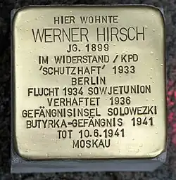 Nach der Haftentlassung emigrierte er nach Prag und schrieb mehrere Berichte über seine Hafterfahrungen. Insbesondere von Hans Kippenberger erfolgten immer wieder Angriffe und Dossiers, in denen Hirsch verdächtigt wurde, ein „trotzkistischer Gestapoagent“ zu sein. Auch der Kontakt zu Zenzl Mühsam wurde ihm vorgeworfen und insbesondere die Verhaftung Thälmanns und anderer führender KPD-Funktionäre. Durch die Entlassung aus der NS-Haft war Hirsch pauschal verdächtig, bei den Gestapo-Verhören zum Verräter geworden zu sein. Ihm wurde deshalb von der KP-Zentrale befohlen, zur Klärung dieser Vorwürfe nach Moskau zu reisen. Wie viele der Komintern-Funktionäre war Hirsch Bewohner des Hotels Lux. Dort wurde er nach vorherigem Hausarrest mit absurden Anschuldigungen am 4. November 1936 verhaftet. Am 10. November 1937 wurde er zu zehn Jahren Lagerhaft verurteilt, nachdem ihm unter anderem vorgeworfen wurde, dass er Thälmann an die Polizei ausgeliefert habe. Hirsch wurde auf die Solowezki-Inseln deportiert, wo er mit Karlo Štajner inhaftiert war. Dieser berichtete in seinen Erinnerungen über den „heldenhaften Kampf“, den Werner Hirsch, der auch in der Gefängnishaft noch an Stalin glaubte, gegen das „Mordregime“ im Gefängnis Muksumala führte. Nach Hungerstreiks wurde Hirsch das Opfer zahlreicher Schikanen der NKWD-Wachmannschaften. Allein während des Jahres 1938 wurde er mit 105 Tagen Einzelhaft im Karzer bestraft. Wie der Mithäftling Štajner berichtet, konnte sich Hirsch kaum noch bewegen und war „so schwach, daß er meist auf den Spaziergang verzichten mußte“. Štajner erzählte Hirsch von seiner Frau und seinem Kind, „von denen er nicht wußte, wo sie waren und ob sie überhaupt noch lebten“. Gesundheitlich sehr geschwächt, wurde Hirsch in das Moskauer Butyrka-Gefängnis überführt, wo er im Juni 1941 an den Haftfolgen starb.[1] In der Sterbeurkunde wurde Herzversagen als Todesursache eingetragen.