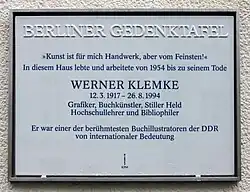 - ↑ Berliner Gedenktafel für Werner Klemke, Pressemitteilung des Berliner Senats vom 14. März 2017.