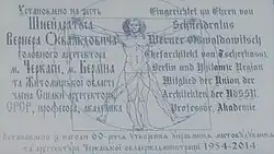- ↑ Errichtet aus Anlass des 60. Jahrestags der Gründung der Verwaltung Städtebau und Architektur der Gebietsverwaltung Tscherkassy 1954 bis 2014 (Privatarchiv Schneidratus, Urheber unbekannt; Übersetzung: Oswald Schneidratus).