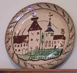 Auf dem roten oder gelblichen Scherben wurden in kraftvollen Farben dekorative Muster und Pflanzenornamente aufgetragen, man bemühte sich, die Farben beim Brennprozess leicht im Hintergrund zerfließen zu lassen. Um 1750 traten zu den Blumenmotiven die Darstellungen von Tieren, Menschen, Schlössern, Kirchen und Szenen aus dem bäuerlichen und handwerklichen Alltag, oft ergänzt mit einem Sinnspruch oder der Jahreszahl. Besonders schöne Stücke entstanden zu Hochzeiten, Geburten, Taufen und ähnlichen festlichen Anlässen.
