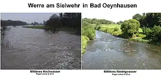 Der Abfluss am Pegel Löhne, dem letzten Pegel vor der Mündung in die Weser und damit unter Berücksichtigung von 89,9 % der Wasserführung des Einzugsgebietes, beträgt bei Niedrigwasser (MNQ) 4,32 m³/s, bei mittlerem Wasserstand (MQ) 18,1 m³/s und bei Hochwasser (HQ) 191 m³/s. Der höchste je gemessene Abfluss wurde am Pegel Herford im Jahre 1960 mit 246 m³/s und am Pegel Löhne im Jahre 1986 mit 340 m³/s registriert. Die geringste Wassermenge am Pegel Herford führte die Werre mit 1,21 m³/s am 11. Oktober 1959 und mit 2,15 m³/s am Pegel Löhne am 6. August 1996.[17] Die höchsten Abflüsse werden grundsätzlich in den Wintermonaten verzeichnet. Niedrigwasser herrscht in den Sommermonaten.