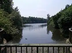 Rechts des Schildes führt Waldweg die Kasterer Höhe Richtung Kaster hinab. An der Brücke über die Kasterer Mühlenerft, links abbiegen. An der Seespitze befindet sich ein Ablaufwehr. Hier führt die Wanderung nach rechts in den Wald. Gegenüber der Infotafel befindet sich hinter der Bank ein Gedenkkreuz. Der 7 ha große See entstand durch den Kohleabbau und ist heute Teil eines Landschaftsschutzgebietes.[2]