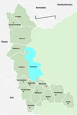 Das heutige West-Aserbaidschan liegt im äußersten Nordwesten Irans. Die Hauptstadt der Provinz ist die 602.403 Einwohner zählende Stadt Urmia. Von hier sind es bis zur Hauptstadt Teheran knapp 900 Straßenkilometer. Nahe der Hauptstadt liegt der gleichnamige See, der ähnlich wie der Vansee in Anatolien ein riesiger Steppensee ist. Je nach Jahreszeit erreichte er eine Fläche zwischen 5000 und 6000 km², war aber bis Herbst 2023 weitgehend ausgetrocknet.[4] Der abflusslose See ist mit einem Salzgehalt von bis 29 % ganzjährig eisfrei. Die Landschaft ist der des benachbarten Ostanatoliens sehr ähnlich, mit hohen Bergen und vielen weiten Hochebenen. Daneben befindet sich die Stadt Mahabad im Süden der Provinz.