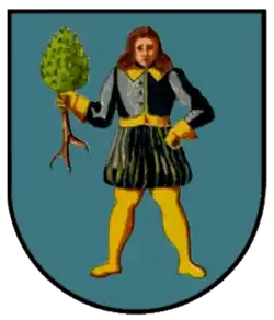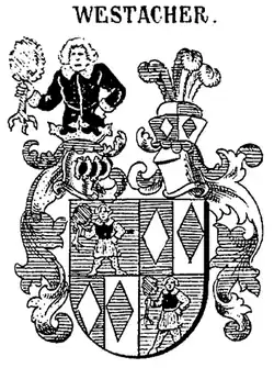 Blasonierung: Das Stammwappen der Westacher zeigt in Blau einen schwarz gekleideten Mann, einen grünen Baum haltend.[5]
