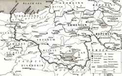 Nach dem Fall der kilikischen Hauptstadt Sis 1375 war das gesamte armenische Siedlungsgebiet unter „totaler Herrschaft des Islam“. Seit dem 16. Jahrhundert war Armenien in ein von den Osmanen beherrschtes Westarmenien und ein von den Persern beherrschtes Ostarmenien geteilt.[9][10] Seit dem Ende der Kämpfe der persischen Safawiden und Osmanen um die Vorherrschaft über Armenien Anfang des 17. Jahrhunderts änderte sich die osmanisch-persische Grenze nicht mehr. Die Armenier wurden in dem weiterhin „Westarmenien“ oder „Türkisch-Armenien“ genannten Gebiet zu einer wenn auch weithin sehr starken Minderheit.[11] Dabei unterlag die „westarmenische Gemeinschaft“ ähnlich den vor der Inquisition geflohenen osmanischen Juden dem Millet-System, das von Dabag als „Duldungsprinzip“ charakterisiert wird, während mache anderen Autoren mitunter von einem „Toleranzsystem“ sprechen.[2] So bezeichnet Friedrich Heyer den siegreichen Sultan als „den Armeniern gegenüber gutwillig und hilfsbereit, um ein Gleichgewicht zwischen den christlichen Völkern seines Reiches herzustellen“, und stellt die Rechte und Privilegien der Armenier unter dem Sultan heraus, weshalb die Armenier – „treue Glaubensnation“ (millet-i sadika) genannt – bis ins 19. Jahrhundert loyal zum Osmanischen Reich waren. Erst durch die russische Expansion und den zunehmenden Machtverlust des Osmanischen Reiches wurden die Armenier als Gefahr angesehen. Insbesondere nach dem Russisch-Türkischen Krieg, als 1878 auch Teile des türkischen Armeniens um die Stadt Kars unter russische Herrschaft kamen, verschlechterte sich die Situation der Armenier in der Türkei. In den letzten Jahrzehnten der osmanischen Herrschaft ging die Zahl der Armenier, die vor allem in den auch als Westarmenien bezeichneten Sechs Vilâyets lebten, durch Massaker zurück. Nach der Machtübernahme der Jungtürken 1908 galten die Armenier nicht mehr als millet-i sadika. Laut Heyer waren Diyarbakir, Bitlis, Van, Musch, Erzerum, Sivas und Elâzig „armenische Provinzen“. Ab dem 24. April 1915 kam es während des Ersten Weltkrieges schließlich zum „Genocid an den wehrlosen Armeniern“, bei dem „über anderthalb Millionen Menschen“ aus Westarmenien starben.[12] Auf Vorschlag des US-amerikanischen Präsidenten Woodrow Wilson wurde im Vertrag von Sèvres 1920 noch ein Armenien mit einem Großteil Westarmeniens vorgesehen, doch kam dies durch die türkischen Siege im Griechisch-Türkischen und im Türkisch-Armenischen Krieg nicht mehr zustande. Mit dem Vertrag von Kars 1922 zwischen Sowjetrussland und der als Nationalstaat neu gegründeten Türkei wurde ein Armenien mit den historischen Siedlungsgebieten der Armenier im ehemaligen Osmanischen Reich Makulatur.[13] Im ehemaligen Westarmenien gibt es seitdem keine armenischen Gemeinden und keine als solche genutzten armenischen Kirchen mehr. Während die meisten Armenier von hier entweder starben oder das Land verließen, leben die zurückgebliebenen Armenier und ihre Nachkommen mit mehr oder weniger verborgener armenischer Identität als Kryptoarmenier.[14]