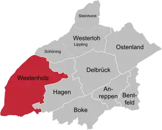 Westenholz ist der westlichste und flächenmäßig mit Abstand der größte Stadtteil der Stadt Delbrück in Nordrhein-Westfalen, Deutschland. Hinsichtlich der Einwohnerzahl ist er nach dem Stadtteil Delbrück der zweitgrößte Ort innerhalb der Stadt Delbrück. Westenholz hat 4.128 Einwohner.[1]